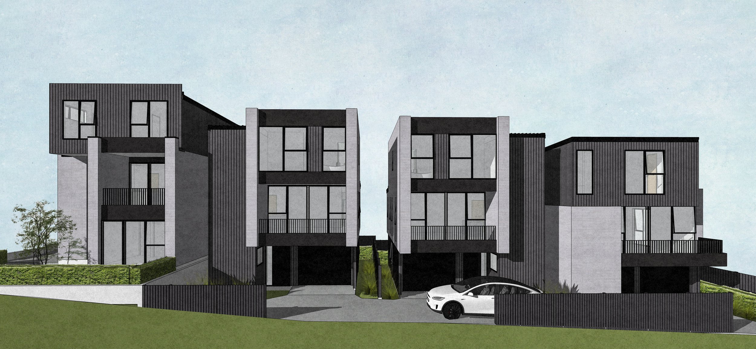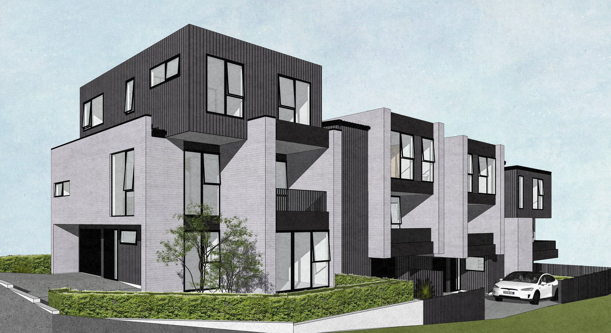 The built form is expressed through a contrast of textures—light masonry and dark vertical cladding—emphasizing verticality and visual rhythm. Generous glazing and recessed balconies introduce natural light, frame views, and subtly break down the massing.
