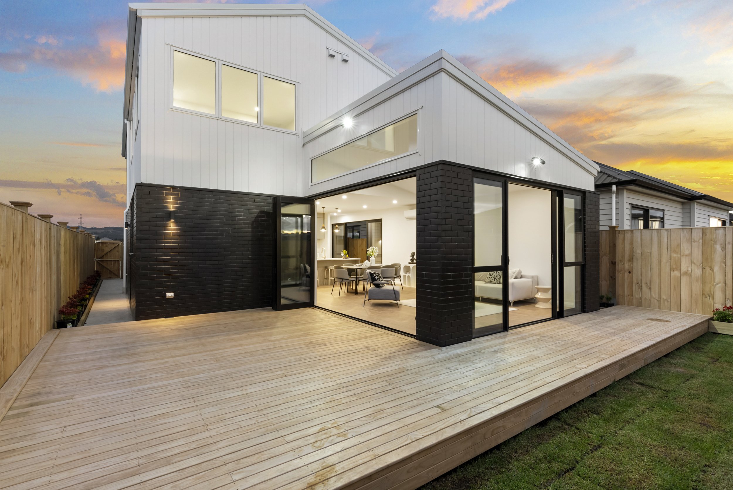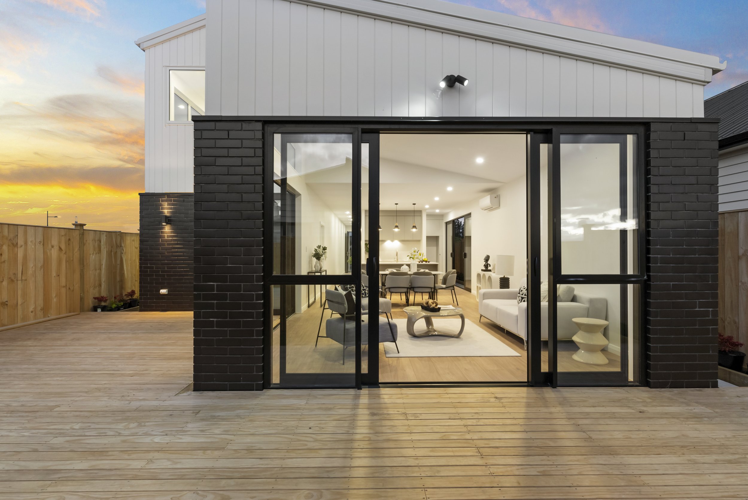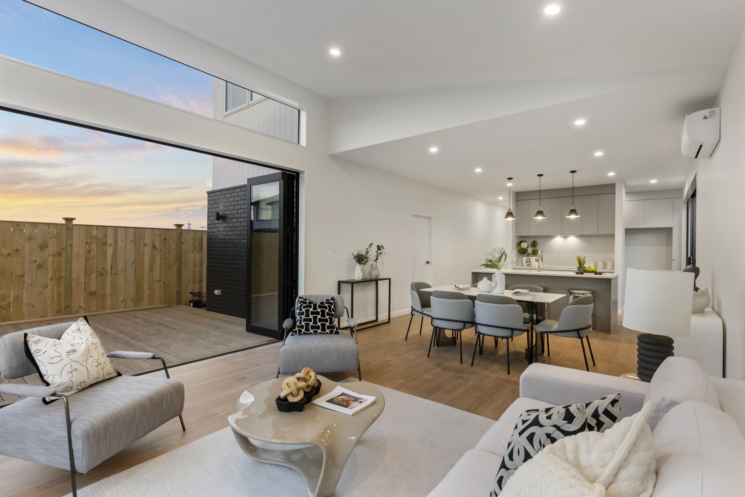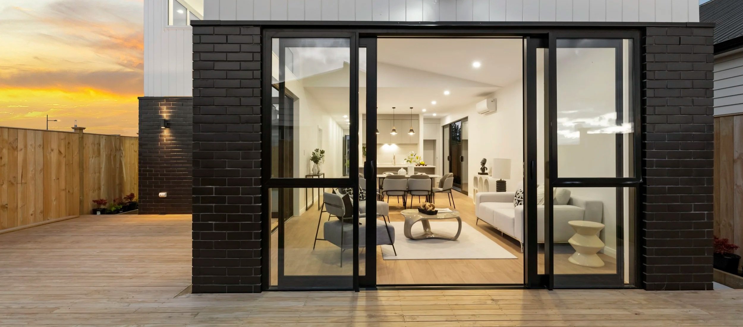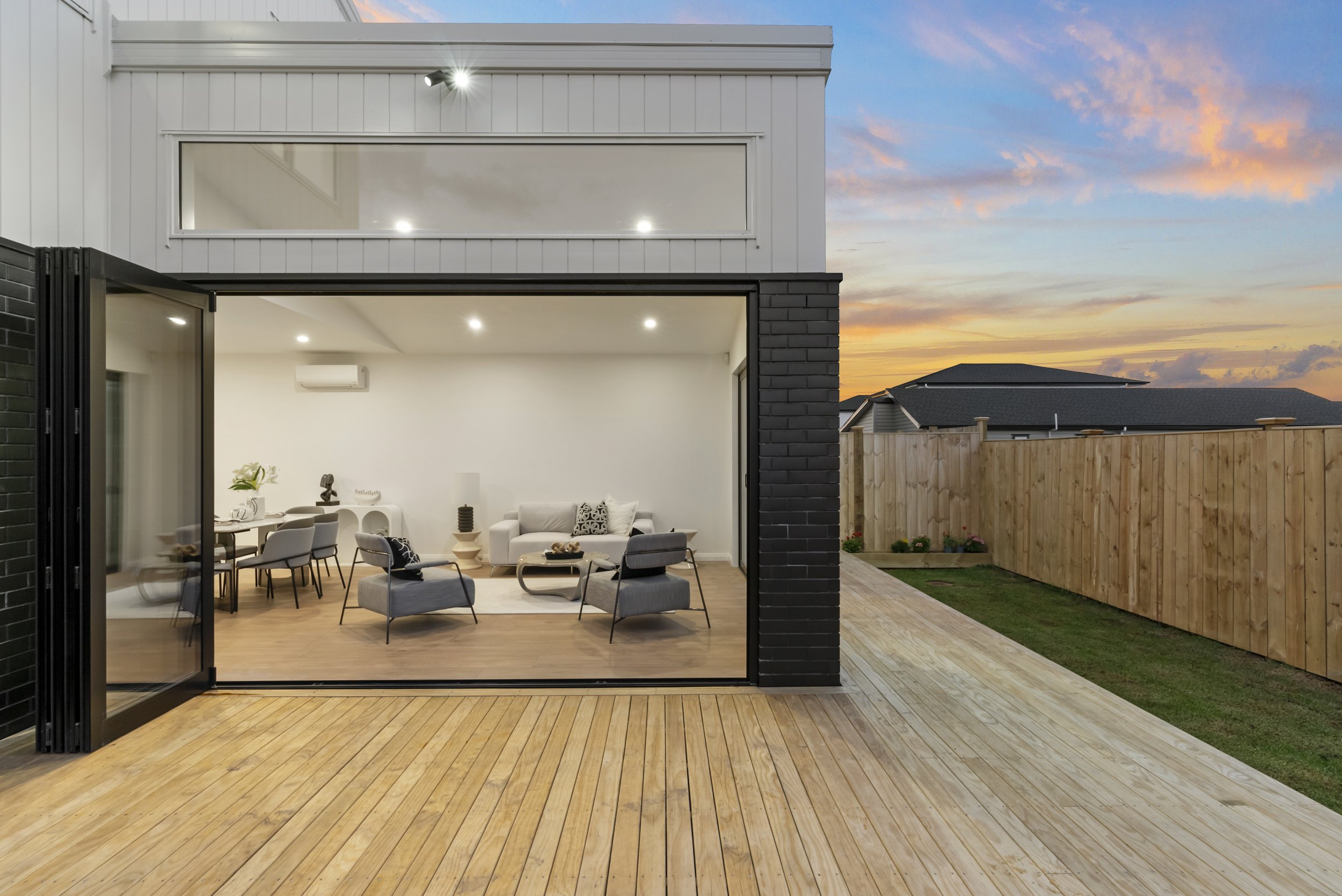 Above, the tilted roof shapes a lofty, light-filled living space, enhancing openness and a sense of volume. Folding doors dissolve the threshold between interior and exterior, extending daily life onto the timber deck and creating an obstacle-free flow to the outdoors.