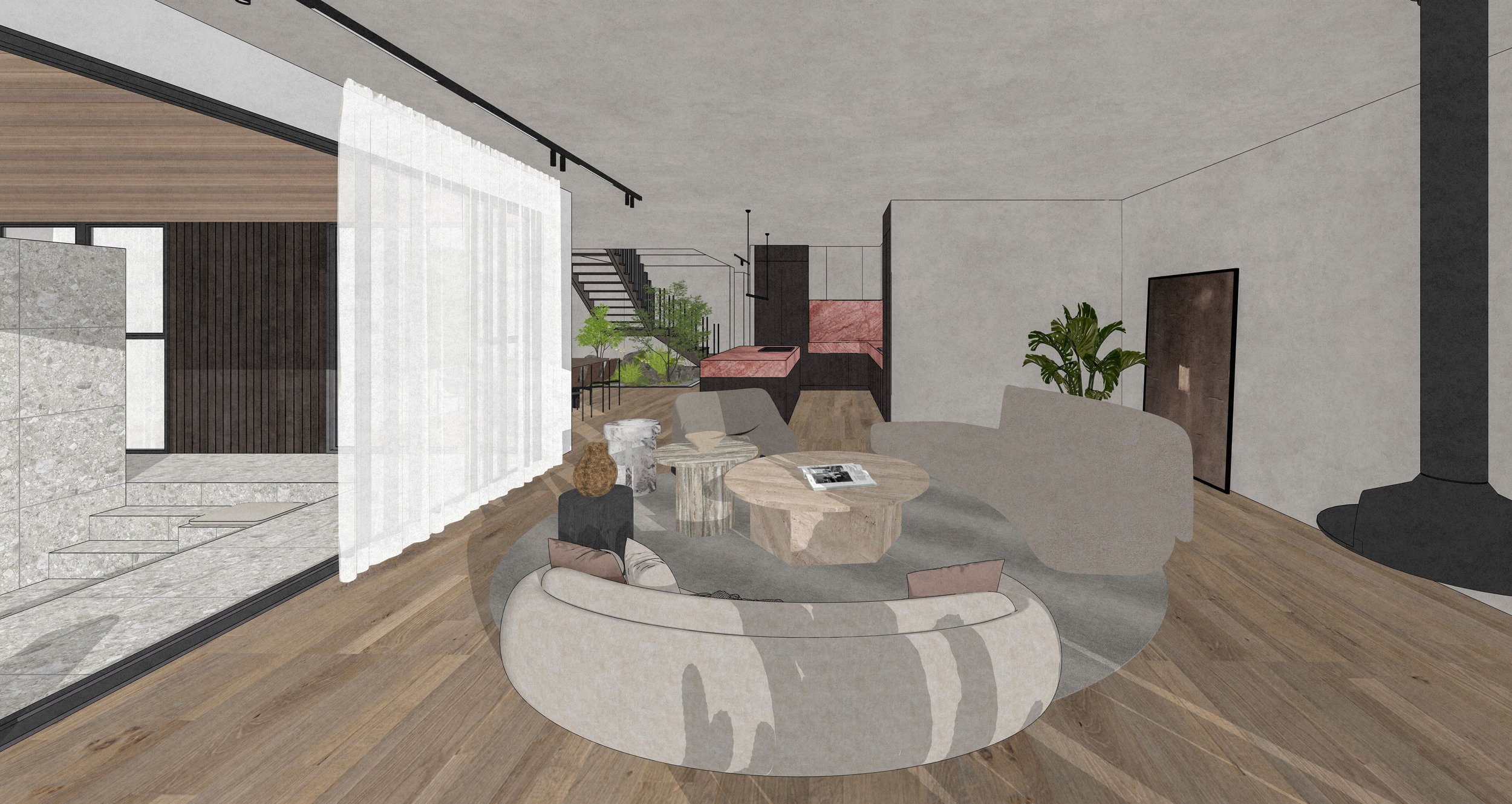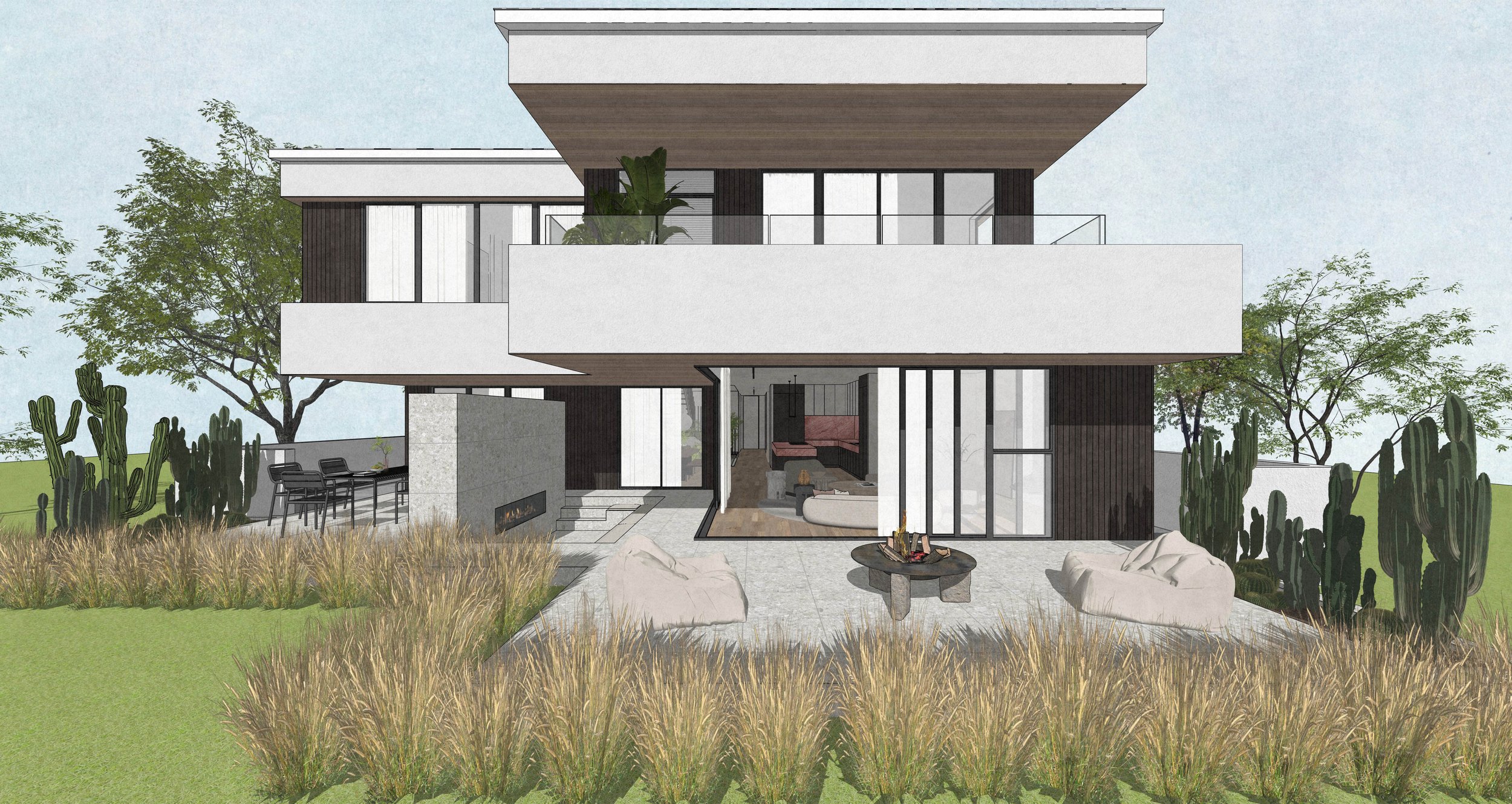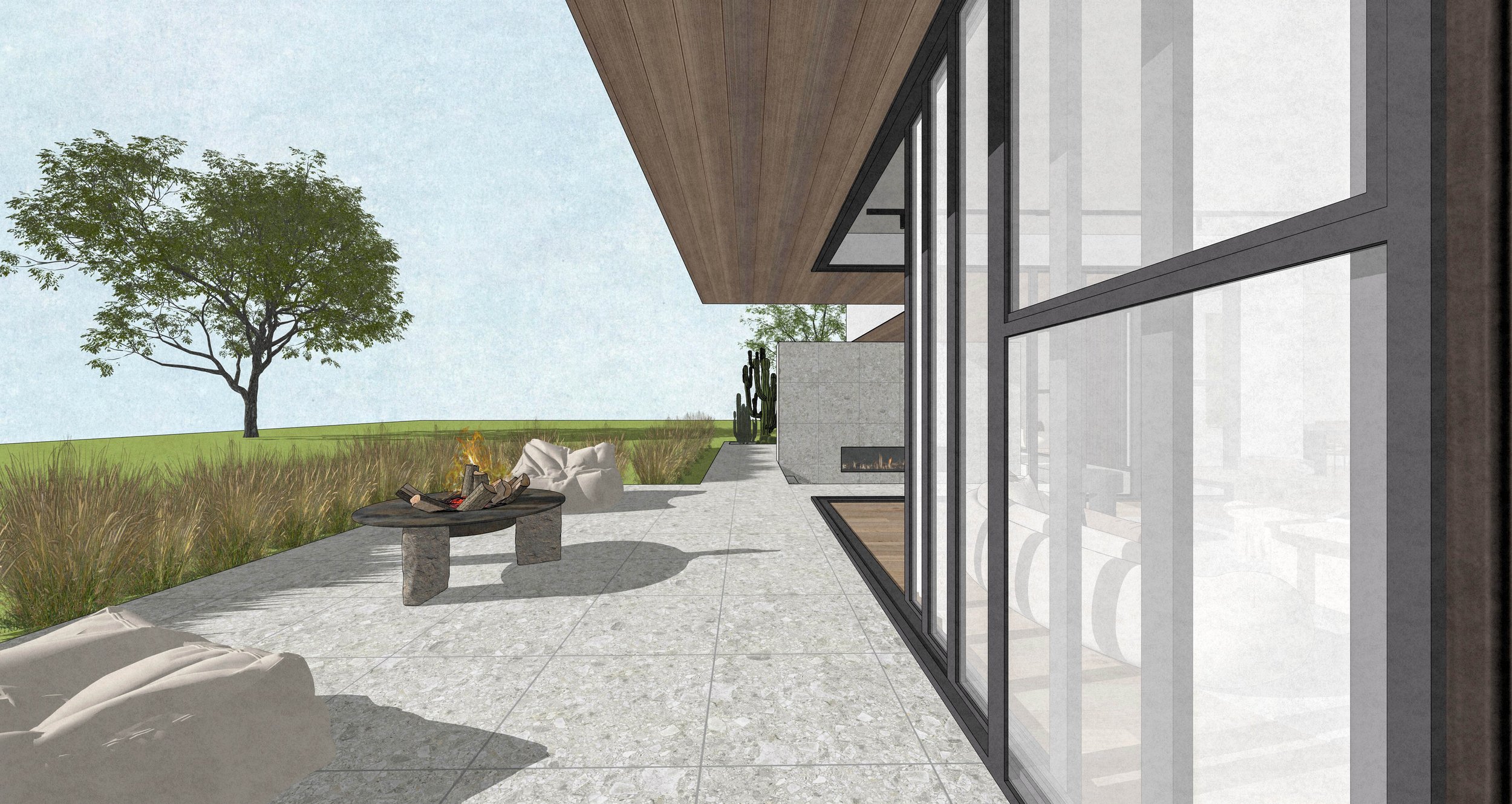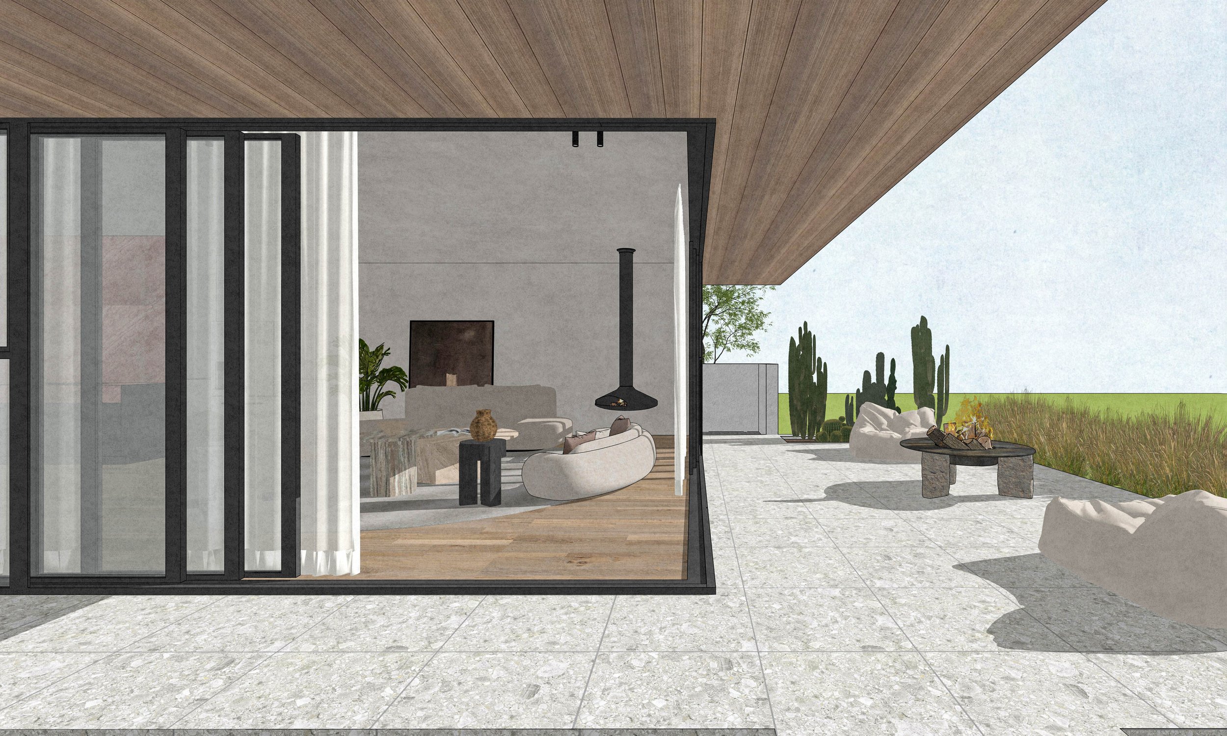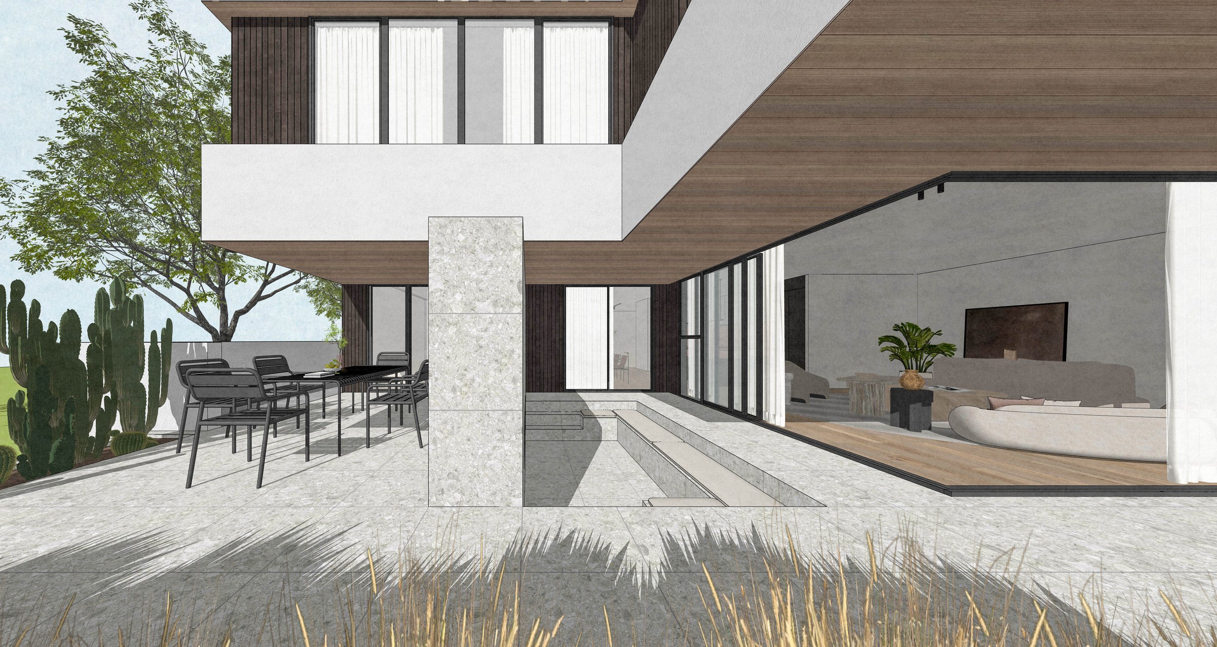 A sunken courtyard lounge anchors the patio, creating a place for gathering and reflection where daily life is celebrated against the backdrop of nature. The design is a narrative of movement — from sheltered intimacy to open horizon — balancing privacy with connection, and simplicity with depth.